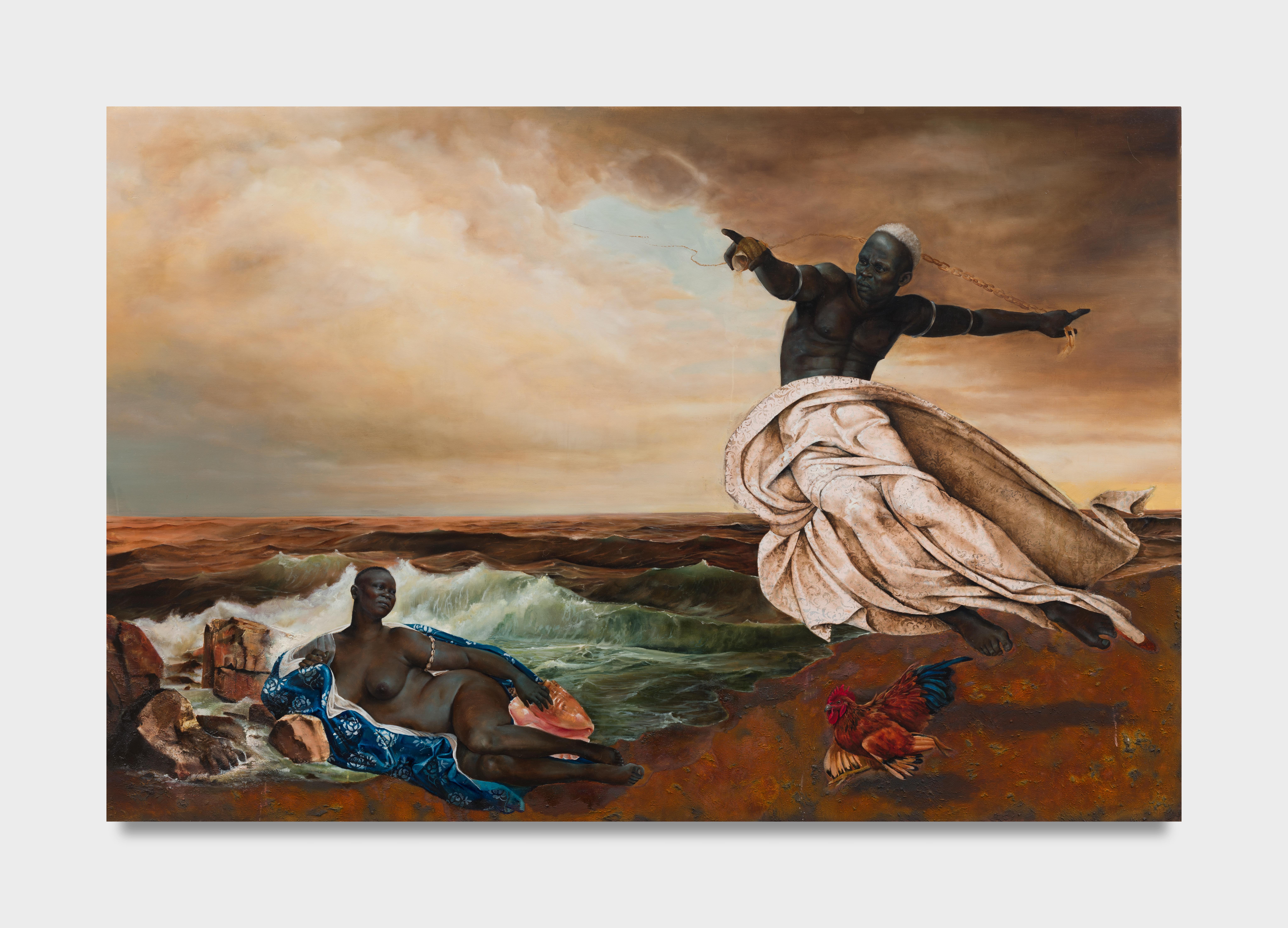 Obatalá’s desire to create land and life on earth was granted permission by the Supreme God. Yet nobody bothered to ask or inform Yemayá who was there with her oceans from the beginning. As Obatalá swings down from the sky on a long chain made of gold donated by the other orishas, he pours out sand and seeds from his seashell to form land. The rooster claws at the ground, planting seeds for forestation and foliage. Meanwhile, Yemayá’s surprised expression indicates the abrupt intrusion upon her kingdom as the oceans were forced to subside to Obatalá’s new land masses. With the loss of territory and an increase in human population, Yemayá demonstrates her power and strength by creating the Great Flood. This painting reimagines frescoes from Michelangelo’s Sistine Chapel ceiling.